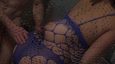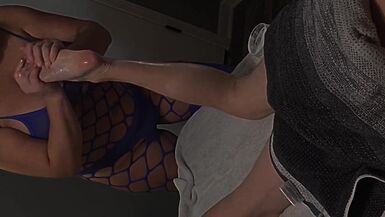 . She wears her blue bodysuit and oils him up. She puts Her hands on his body and her mouth on his cock. He bends her over the table making her orgasm hard before cumming all over her face and mouth