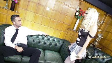 . Horny blonde maid wraps her lips around a big thick dick before getting her pussy pounded hard on the couch until she gets cum all over her face.