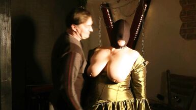 . She have to wait in the dress of the O of her master. First he plays with her big tits exposed and then she must lie on the floor and open the mouth wide. She gets a big load of pee directly into her