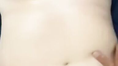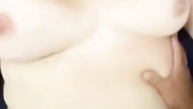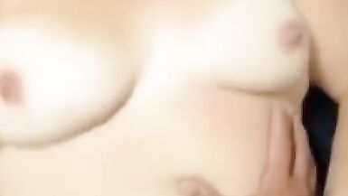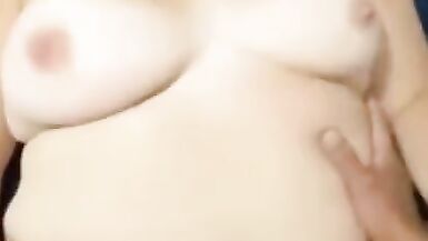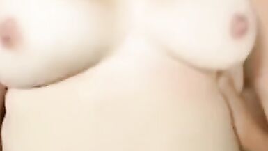 Wife caresses her big boobs. Oil massage. Cum on big tits.